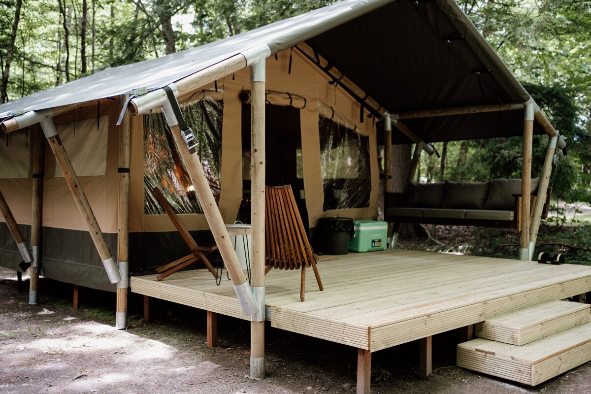 Profitez du cadre charmant de cet endroit romantique dans la nature. Sugar Brook Glamping offre l'excitation du camping en plein air avec le confort pour ajouter la perfection absolue à votre expérience de camping. Cette plateforme surdimensionnée avec tente en toile comprend un barbecue privé, votre propre foyer et, mieux encore, vous êtes à 3 minutes à pied du salon commun de Basecamp pour profiter de toutes les commodités telles que 2 salles de bain entièrement équipées avec douches à l'italienne. Nous fournissons des serviettes, du gel douche. Cuisine complète, WIFI et plus encore !!
