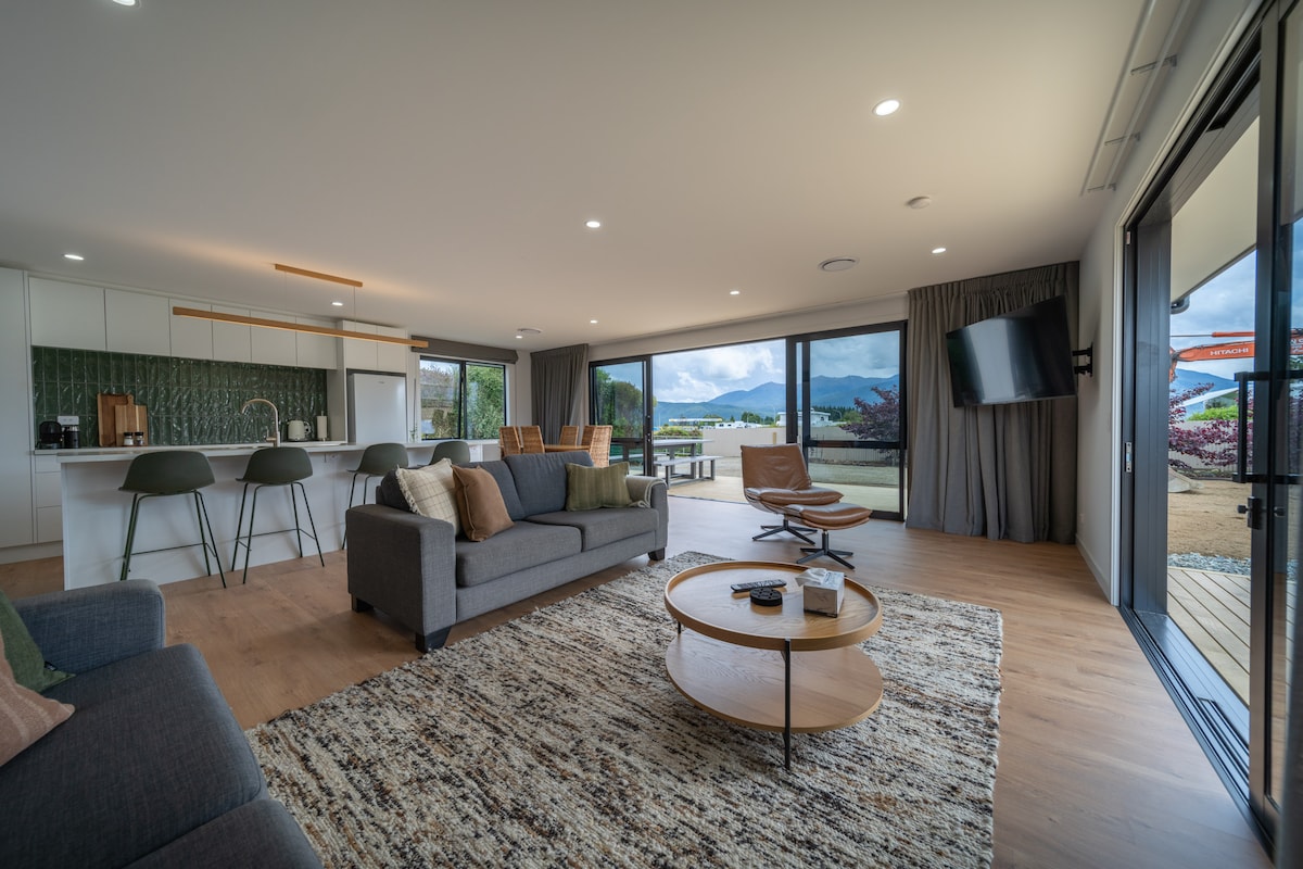 Donnant sur Fergus Square, notre appartement est récemment rénové et décoré. Les portes vitrées s'ouvrent sur une terrasse couverte pour se détendre à l'extérieur. Entièrement isolé et avec une pompe à chaleur, vous serez au chaud et à l'aise quel que soit le temps. À seulement quelques minutes à pied du lac et à 5 minutes à pied des commerces, cafés et bars, l'emplacement est parfait ! Beau lac, montagnes spectaculaires et sentiers de randonnée facilement accessibles. Nous avons hâte de partager Te Anau avec vous.