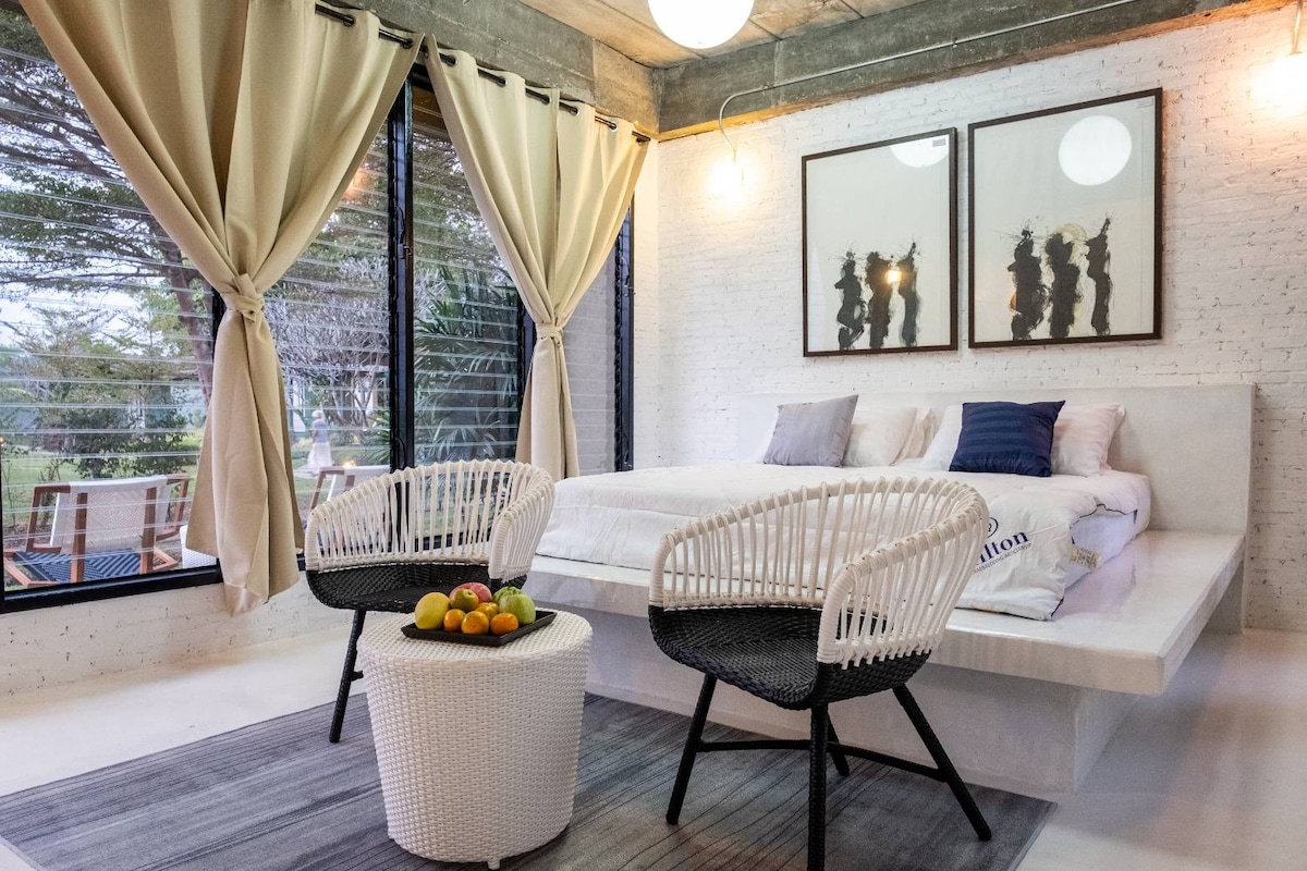Enjoy your own private villa surrounded by gardens and mountain views. Take a stroll along the paths, relax by the lake, or hang out on the rooftop terrace and soak in the scenery. With your own bedroom, living area, and private bathroom, it’s the perfect spot to unwind and enjoy the calm of nature — all just a short drive from Pai town.