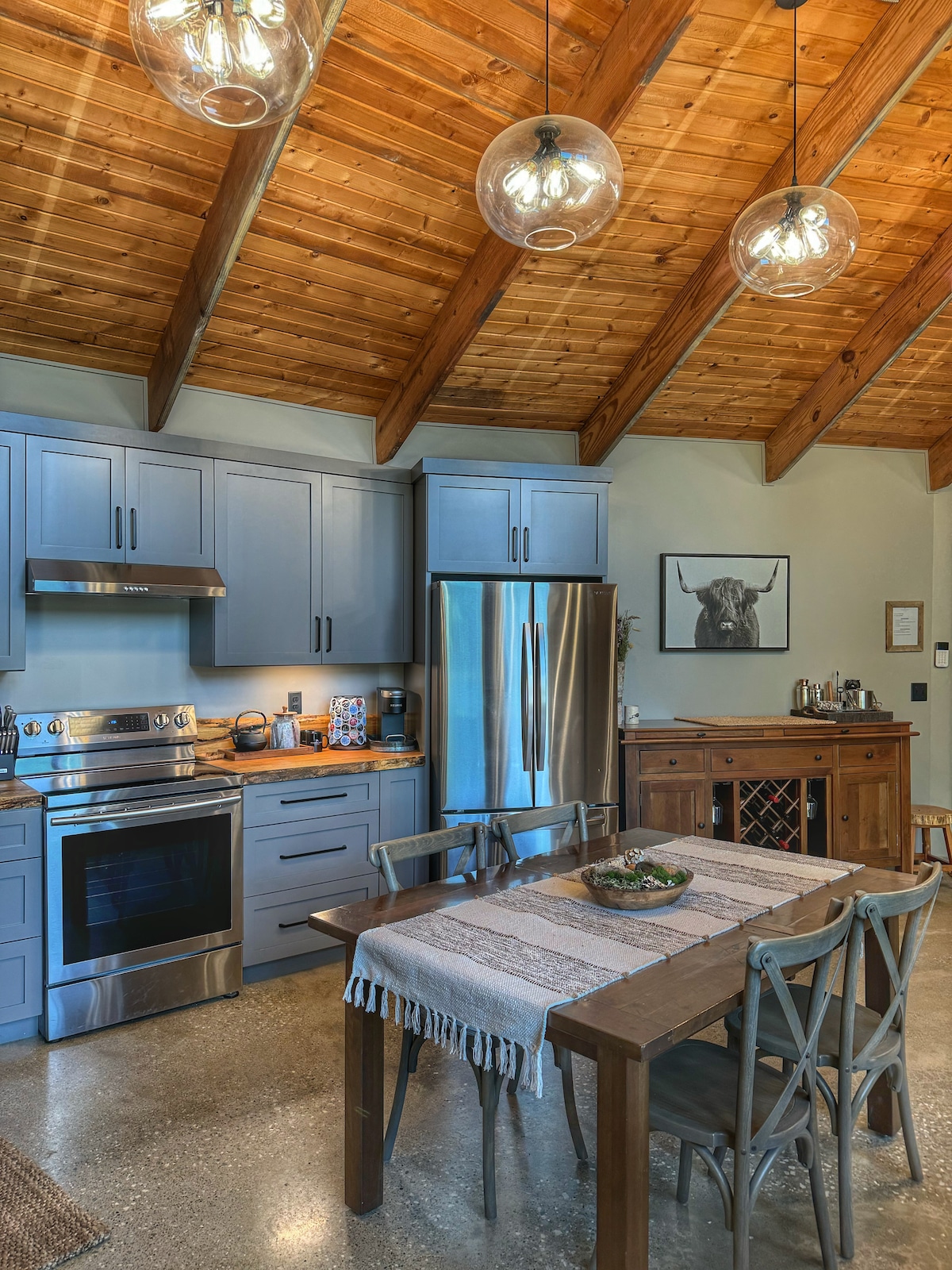 La maison de ranch moderne de nouvelle construction présente un design rustique haut de gamme avec de beaux intérieurs confortables et du confort à chaque tournant. De superbes vues vous attendent avec des fenêtres du sol au plafond donnant sur la magnifique Silver Creek et la nature environnante. La terrasse privée est spacieuse et accueillante avec un jacuzzi surdimensionné, un foyer en béton, un barbecue à gaz et un mobilier de salle à manger en plein air. À quelques minutes d'excellents restaurants, de la brasserie Garrett's Mill et du café le plus cool. Escapade de week-end ou séjour d'affaires parfait.