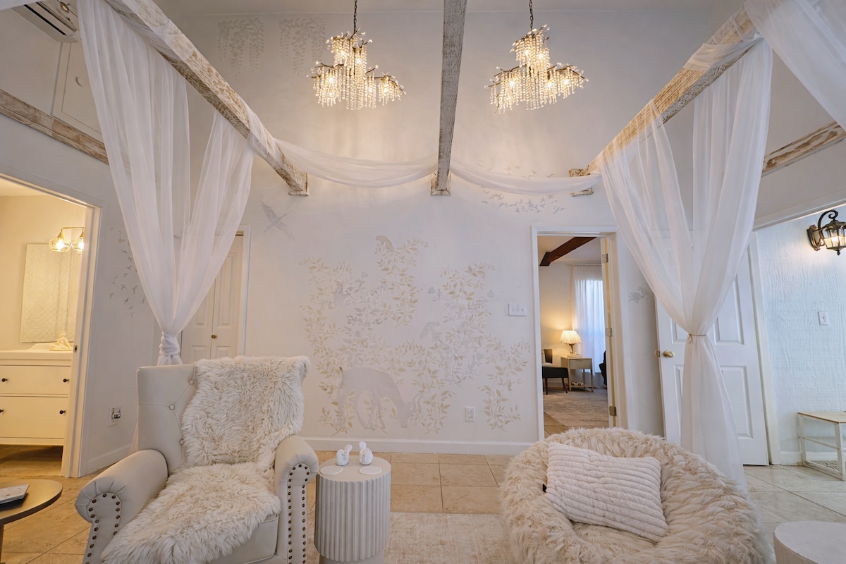 Venez vous détendre dans notre élégant et unique Tree Loft. Nous avons converti un studio de photographie de plus de 800 pieds carrés en un appartement tendance. Le plafond du séjour culmine à 20 pieds. Suspendue au-dessus du séjour se trouve la chambre avec vue sur la cime des arbres. La salle de bain est juste en dessous de la chambre en bas de l'escalier. De généreuses fenêtres font entrer l'extérieur dans la pièce. Sortez sur le porche grillagé pour votre café du matin ou dans la petite cour arrière privée entièrement clôturée.