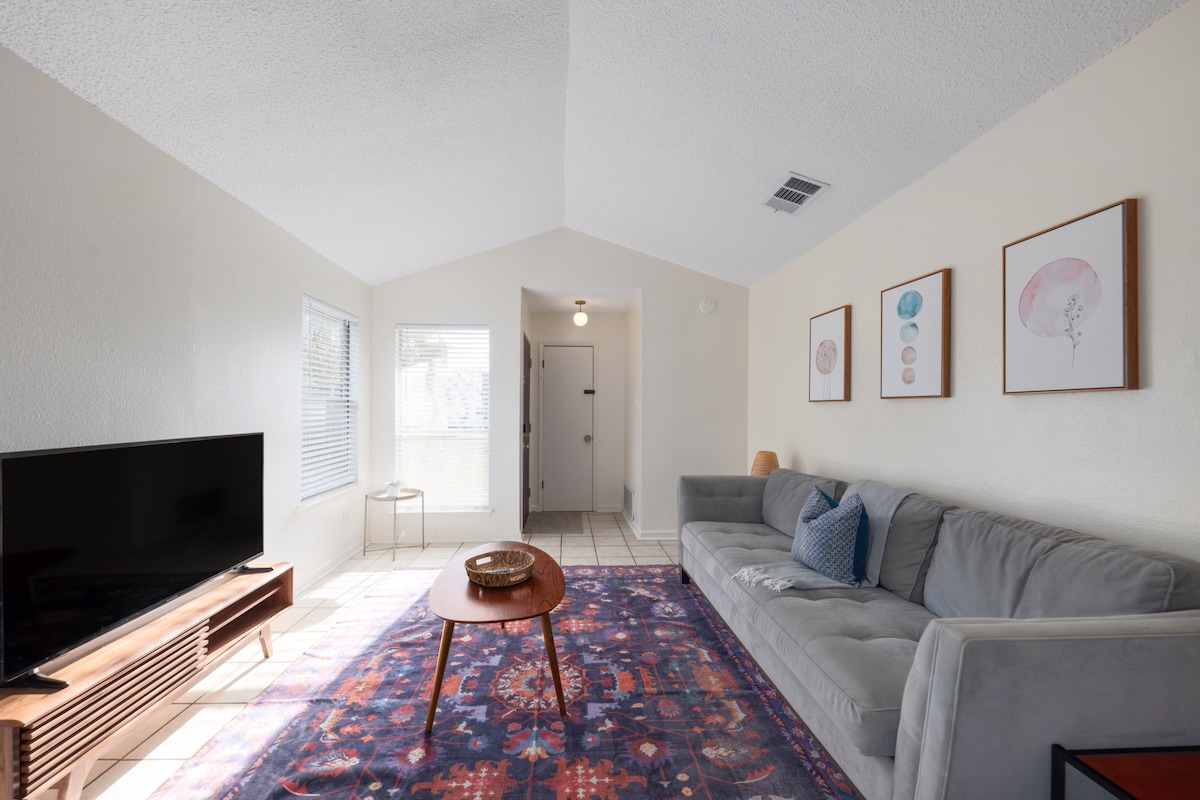 Bienvenue ! C'est une excellente base centrale pour les voyageurs qui cherchent à découvrir tout ce qu'Austin a à offrir ! À environ 10-15 minutes de tout (aéroport, centre-ville, circuit des Amériques, etc.) Que vous soyez ici pour l'un des nombreux événements (ACL, SXSW, Formule 1...), une escapade d'un week-end ou un voyageur d'affaires, c'est un excellent espace à appeler le vôtre pendant votre visite. Entièrement meublé, télévision connectée 55 pouces (Netflix), accès Wi-Fi fibre G00GLE, arrivée flexible avec entrée sans clé.