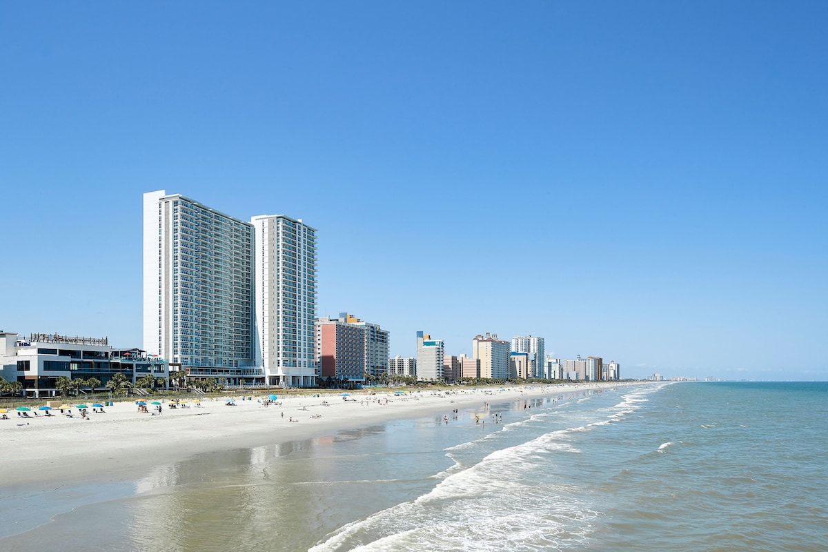 Myrtle Beach, SC-No detail is overlooked at this charming place to stay. Very nice beach view, beach access, quiet area - Get to beach within a few minutes and/or enjoy the pool lounging or hot tub in evening! Downstairs bar at night, breakfast in morning & turtle bay for lunch ! Starbucks located inside resort as well! What else do you need? Welcome packet , kids games, first aid, 2 beach chairs available, pool noodles too! Fresh laundered Sheets, comforter & bath towels provided!