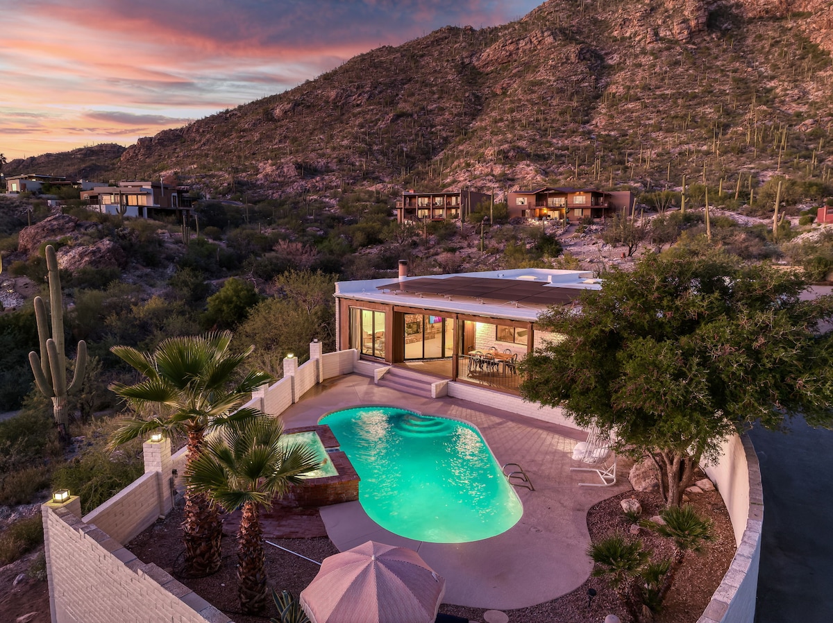 Une charmante casita avec vue imprenable sur le majestueux parc national de Saguaro et les montagnes de Picture Rock pour des couchers de soleil spectaculaires. Le site de 5 acres abrite de nombreuses variétés de cactus, y compris des saguaros géants et d'autres plantes et arbres indigènes. À travers les fenêtres panoramiques de la casita, vous pouvez observer la végétation du désert, les oiseaux, les lapins, les coyotes, les lynx, les pécaris et les cerfs. Un bain du soir dans le jacuzzi sous le ciel étoilé restera certainement gravé dans votre mémoire pendant longtemps.