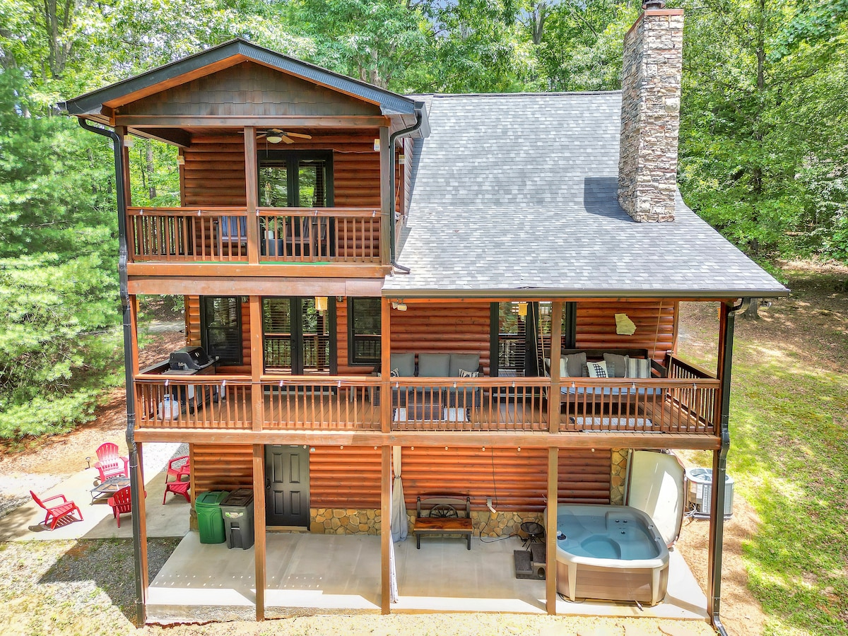 Bienvenue à The Wily Wolf, une charmante cabane rustique moderne à seulement 7 minutes du centre-ville de Blue Ridge. Cette cabane peut accueillir jusqu'à 10 personnes avec 1 lit king size et 4 lits queen size. Profitez du spacieux espace de vie extérieur avec un jacuzzi, des radiateurs suspendus, un gril et un fumoir, un coin repas, une cheminée et 5 téléviseurs connectés avec le câble, et bien plus encore ! Le deuxième niveau offre une salle de jeux amusante avec une table de billard, des jeux d'arcade et un foyer sur le balcon, ce qui en fait la retraite de montagne idéale.