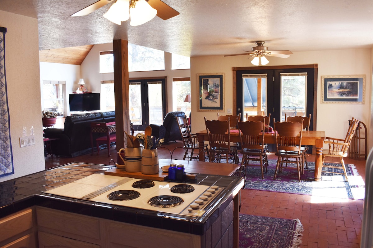 Bienvenue à Glass Valley, une nouvelle maison (juin 2021) conçue et construite pour maximiser la vue magnifique sur la vallée en contrebas et les montagnes au-delà. La plupart des gens qui visitent Pagosa Springs veulent passer leur temps à l'extérieur, ce que vous pouvez faire ici, même lorsque vous rentrez chez vous. La terrasse partiellement couverte de 40 pieds de long à l'étage et la terrasse couverte de 17 pieds en bas font face à l'ouest, ce qui vous permet de profiter du petit-déjeuner ou de votre café du matin en plein air et, lorsque vous rentrez chez vous, de profiter des magnifiques couchers de soleil.
