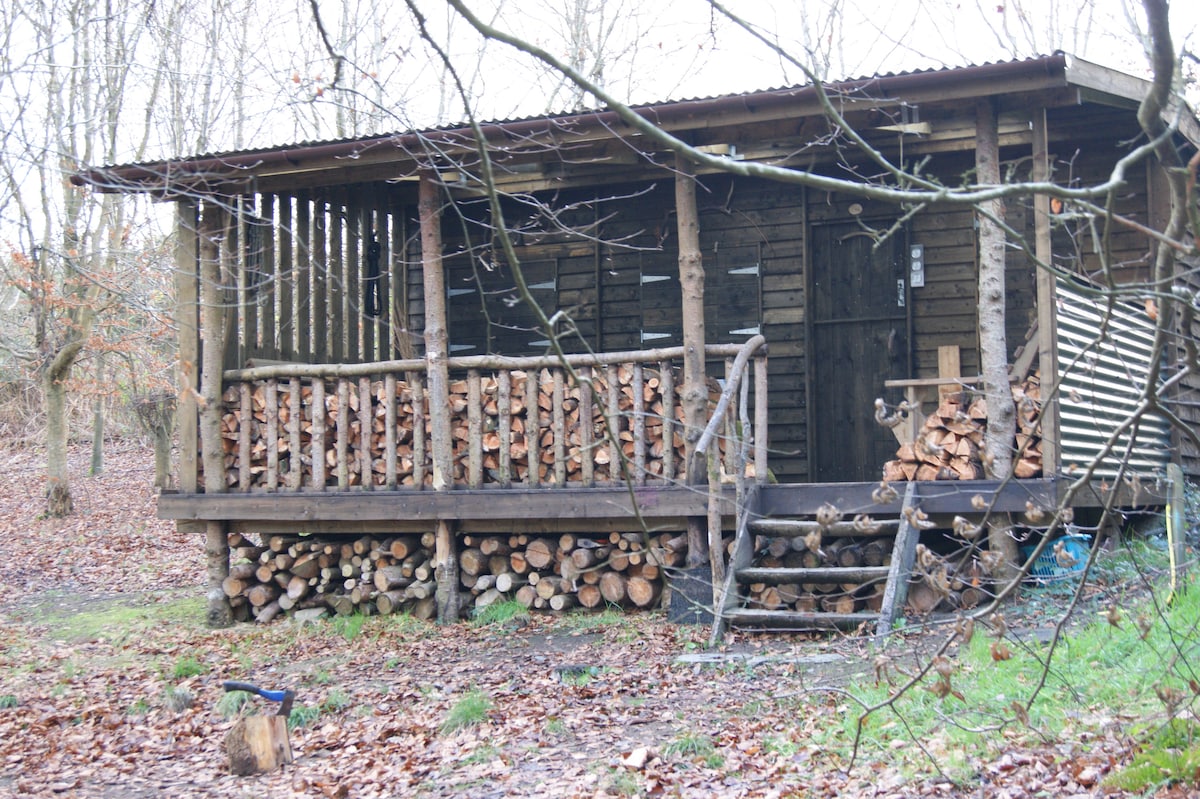 « The Hideout », niché parmi les hêtres, à 10 minutes à pied de la route, est un espace de vie spacieux, beau, chaleureux et ouvert. Il dispose d'un lit double niché dans son propre coin, d'un poêle à bois, de canapés, d'installations de cuisine de style camping et d'une véranda couverte. Il est entièrement caché et isolé et vos seuls voisins seront la faune. Il y a des toilettes sèches et un ruisseau pour se laver. Apportez une lampe de poche et échappez à tout - une expérience Bear Grylls avec des fioritures !