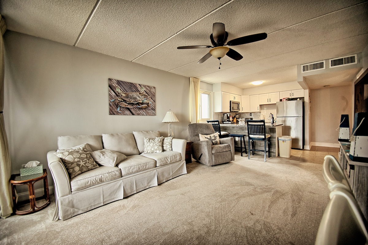 Condo récemment rénové ! ! - Vue sur l'eau. Observez la circulation des bateaux. - Balcon controversé avec des sièges confortables. - Canapé LoveSac confortable. - Marchez jusqu'à la promenade ou à la plage - 15 minutes. - Marchez jusqu'au parc d'amusement Jolly Roger. - Préparez le quai de la communauté en dessous du logement. - À proximité des repas et des achats. - Kitchenette pour cuisiner les repas. - Wifi rapide et téléviseurs en streaming. - Maison entièrement approvisionnée. Draps, serviettes propres, papier toilette, serviettes en papier et plus encore !