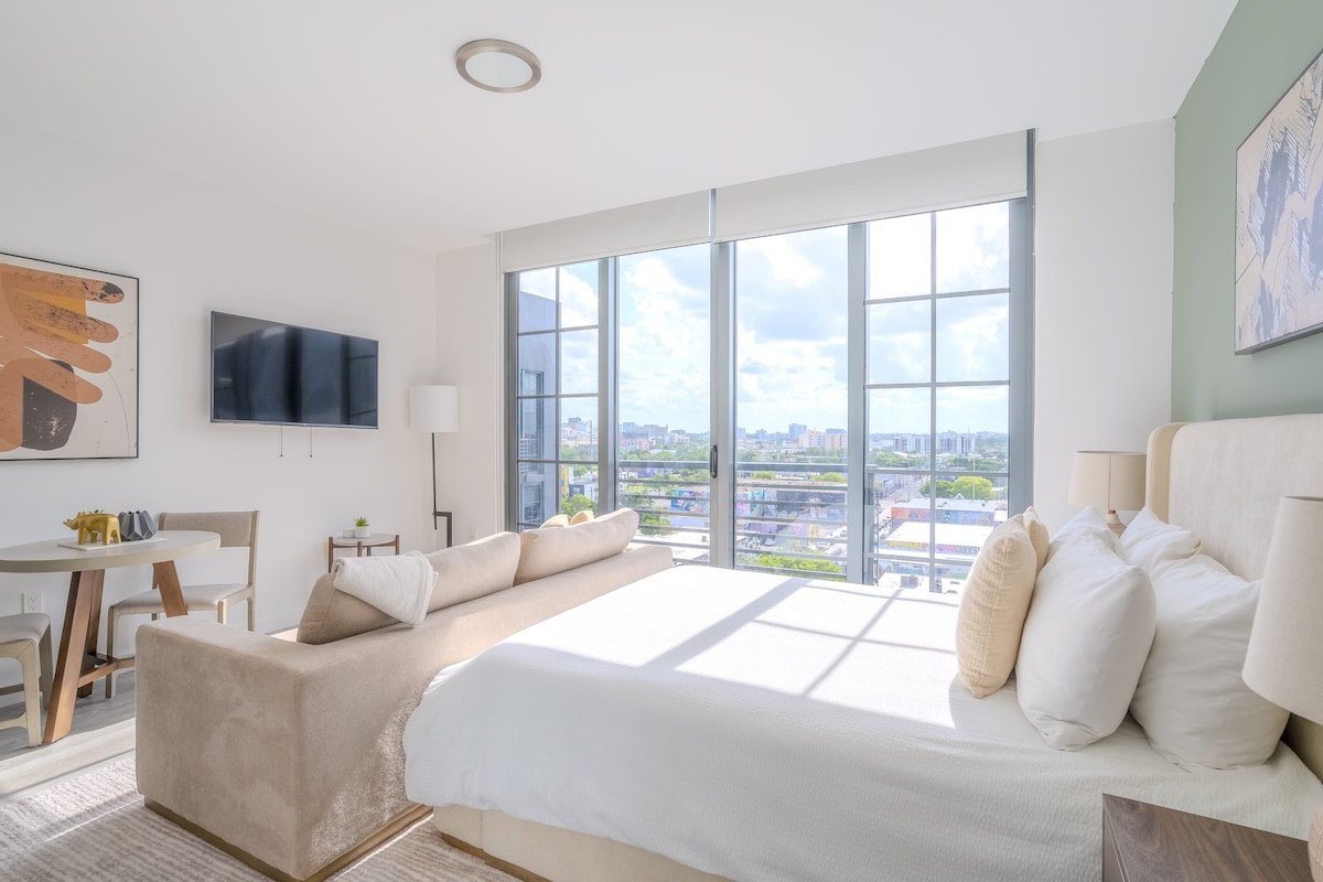 Le Juliet XII est un studio spacieux situé au huitième étage d'un magnifique immeuble à Wynwood, à Miami. Accessible par ascenseur, il dispose d'une cuisine, d'une connexion Wi-Fi, de la climatisation, d'une buanderie dans le logement et d'un parking payant pour deux personnes. Le street art coloré et les brasseries artisanales de Wynwood en font le quartier le plus photogénique de Miami, tandis que les boutiques de luxe et la scène gastronomique innovante du Design District apportent une énergie créative à proximité.