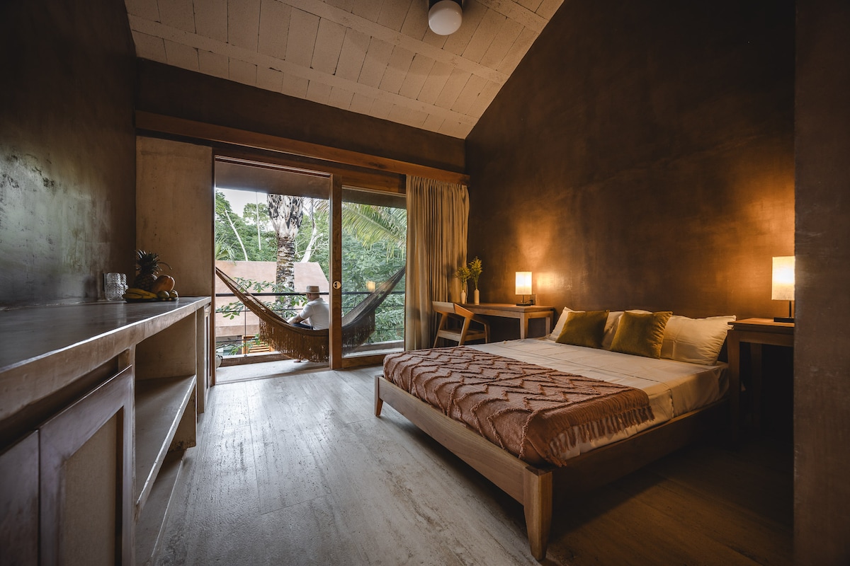 Vivez une expérience unique où l'architecture mexicaine contemporaine fusionne avec la beauté naturelle et la culture locale. Profitez d'une vue panoramique depuis votre terrasse et explorez une communauté autochtone authentique avec tout le confort de la ville. La chambre offre confort et élégance dans un environnement serein, idéal pour se concentrer. Idéalement situé pour explorer les plages, les villages, les sites archéologiques et les cénotes. Nous vous attendons à bras ouverts !