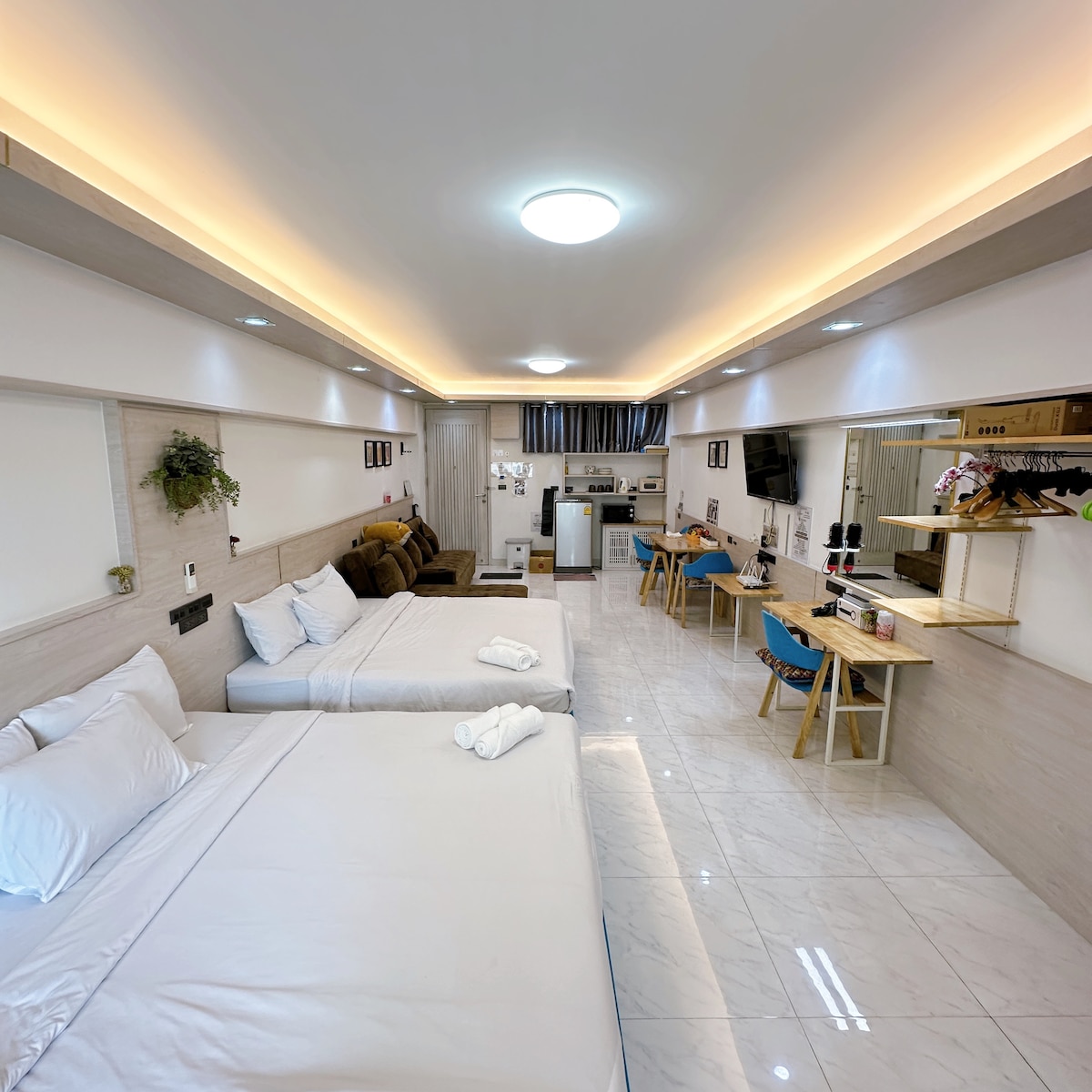 Vous pouvez choisir et séjourner dans mon appartement et je vous souhaite un excellent voyage en Thaïlande. La maison est située à RAMA9, LOFT livré en 2024.La chambre fait environ 40 mètres carrés, y compris une chambre, un salon et une salle à manger, une cuisine et une salle de bain, pouvant facilement accueillir 3 adultes. (‼️ Conseils : lorsque le nombre de personnes dans la réservation est de 1 à 2, par défaut, il n'y a qu'un seul lit dans la chambre, si vous devez ajouter un canapé-lit, veuillez indiquer 3 personnes au moment de la réservation, et contactez-nous après la réservation pour nous en informer, nous organiserons le personnel pour préparer le canapé-lit avant votre séjour ‼️) Le prix de la réservation comprend l'utilisation de toute la maison, ainsi que du centre de remise en forme, de la piscine et de l'espace de bureau partagé.
