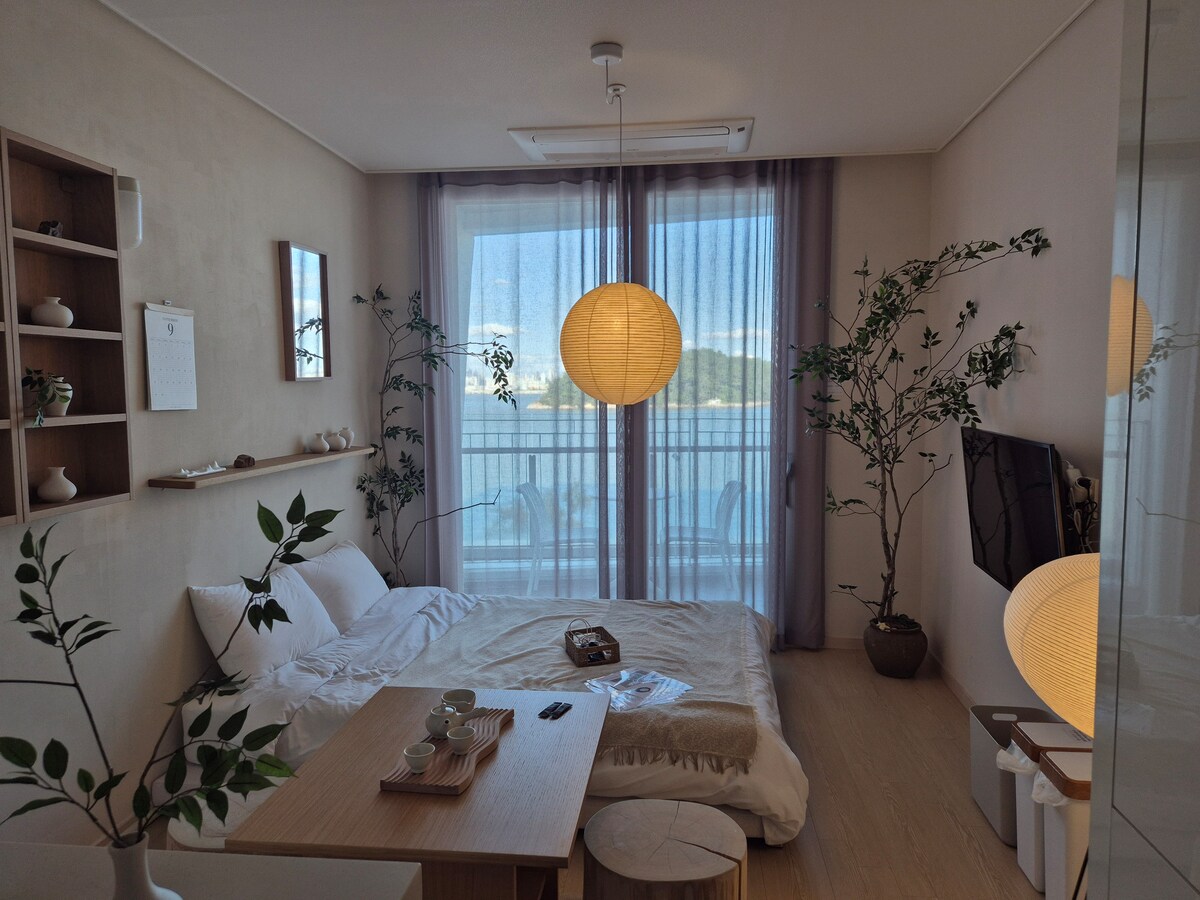 [Service de vin GRATUIT !] [Réduction pour les séjours prolongés] Cliquez sur « Afficher plus » pour plus d'informations ci-dessous ! Profitez d'une vue imprenable sur l'océan dans ce logement avec 2 chambres et salle de bain partagée (539 pieds carrés). à quelques pas de la belle plage. à 10 min à pied de « l'ßle de Mokseom » et à 5 min à pied de « Bbul-dabang », le célÚbre café. Nous proposons également des barbecues électriques, une baignoire spa, un ascenseur, un parking gratuit et une connexion Wi-Fi.