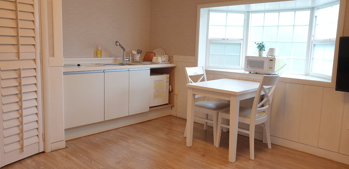 C'est un petit havre de paix dans la forêt, calme, rustique et exotique, situé sur une colline sur la route 59 de la rive du fleuve Han, à 10 minutes en voiture de Dan Yang. Il peut être utilisé par 1 personne par défaut jusqu'à 2 personnes sans frais supplémentaires. Vous pouvez voir le magnifique fleuve par la fenêtre et le jardin que la propriétaire entretient dans la cour arrière. Le barbecue est possible, et il y a un coût supplémentaire de 20 000 won pour allumer le charbon de bois sur le gril. Des sandwiches et des cafés américains faits maison sont servis entre 8h et 10h. Chiens acceptés (1 animal maximum, supplément de 10 000 KRW.) Il est connecté au parking, vous pouvez donc vous garer juste devant la chambre et c'est gratuit. Profitez d'un séjour de détente dans ce lieu calme.