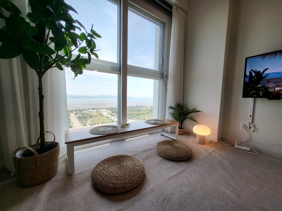 [Breeze32] #Vue sur l'océan au 32ème étage #Coucher de soleil #Literie hôtelière #Détente · Travail · Cuisine #Aéroport d'Incheon à 30 minutes