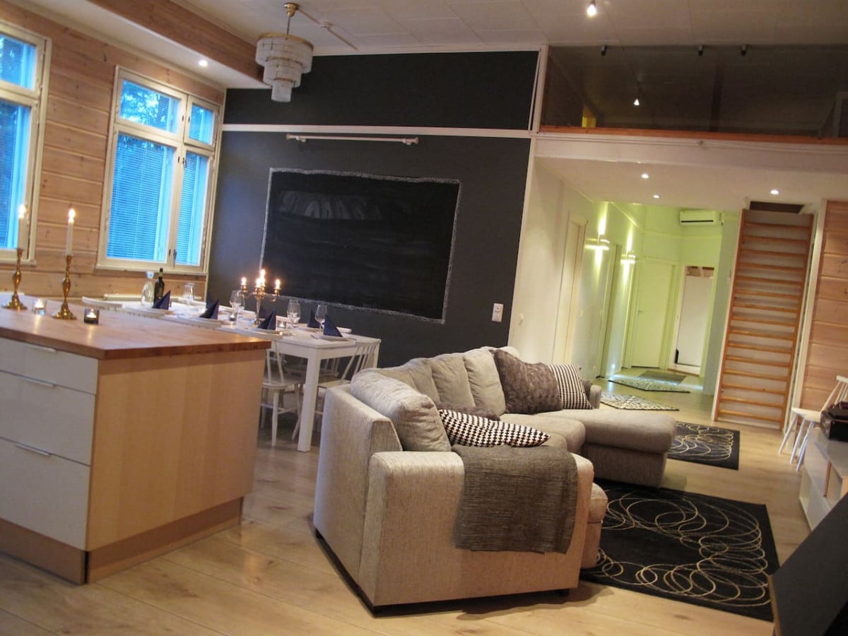 Culture, fitness et dîner depuis le pas de la porte, en plein centre ville. Que vous souhaitez faire aujourd'hui ? *Église à 400 m * Centre culturel à 400 m (en rénovation) * Olvi Hall et le magnifique musée de la brasserie (droit d'entrée € 0 au fait) 440 m * Place du marché 130 m * centre commercial 30 m * pistes de ski de 160 m *Espace événementiel Luuniemi (Oluset, Runni Rock) 240 m *terrains de tennis à 1 000 m *mini golf 460 m *pub 300 m *plage 250 m * emplacement d'exercice à proximité 250 m * Salle DE sport 24 h/24, 7 j/ Le salon est partagé avec un rideau intermédiaire si nécessaire 2 comme son propre espace.