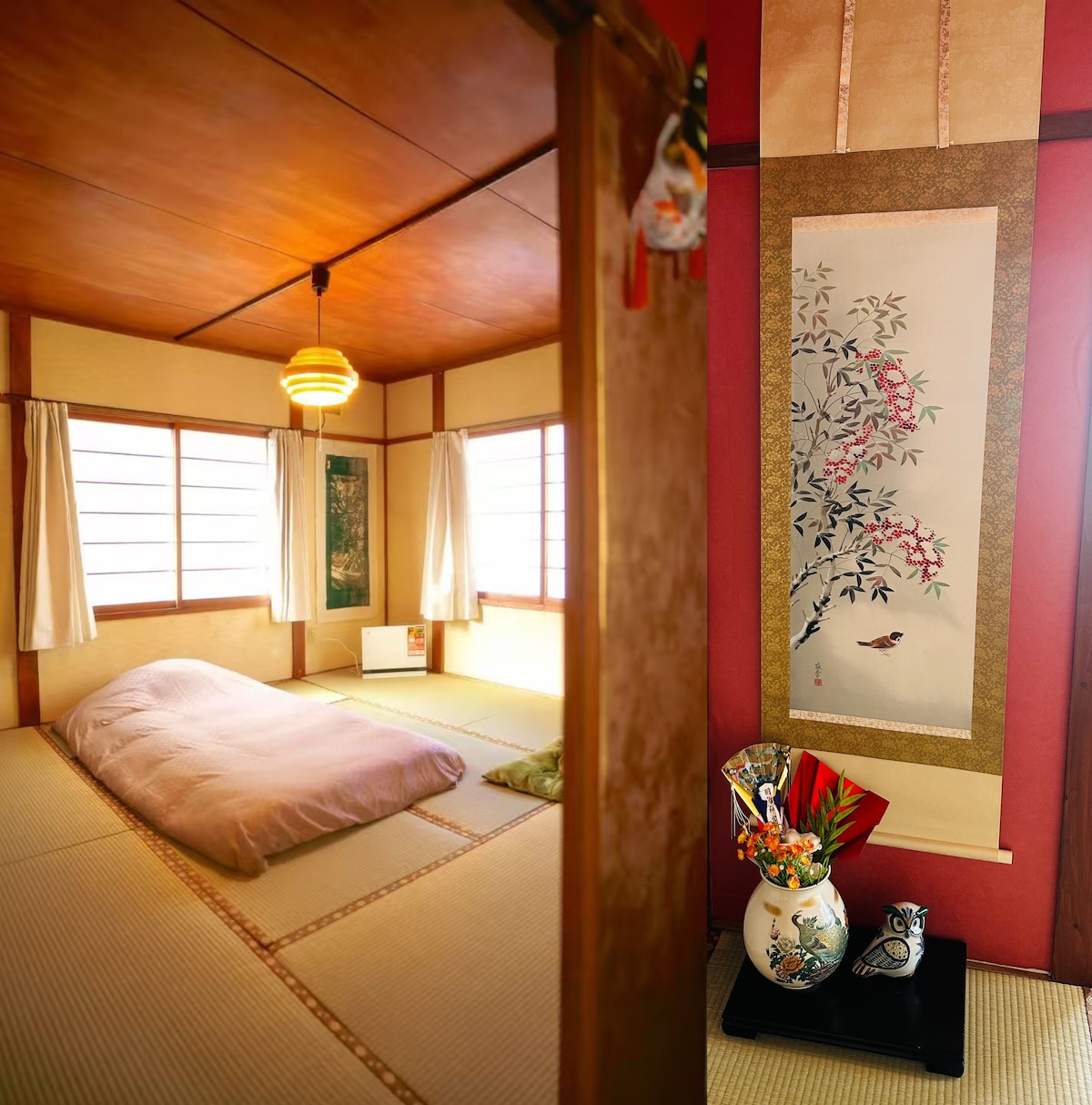 Seiki A101 « Murasaki Shikibu » — une chambre calme façonnée par la littérature et l'art. « Dans le vent et les feuilles qui tombent, continuez le calme du Conte de Genji. » Une chambre tatami sereine avec un petit jardin derrière le shoji. 🛏️ Premier étage, 6 tatamis, deux lits. 🍁 Vue sur le jardin d'hiver. 🎿 Expériences payantes : cours de ski certifiés, cérémonie du thé, composition florale, location de kimono, photographie. 🎨 Vous partagez la maison avec un couple d'artistes-conservateurs parlant couramment le chinois et l'anglais.