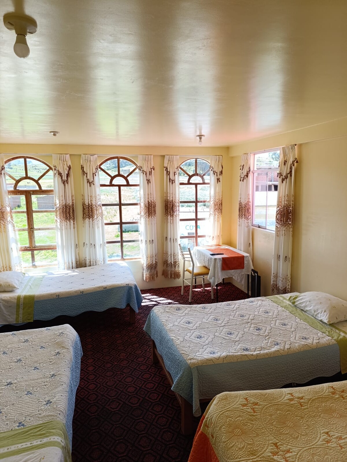 Hotel Summita habitacion doble vip con vista al exterior paisaje natural muy cerca al lago titicaca capacidad para tres personas habitacion con aire acondicionado, calefaccion cochera o parqueo y desayuno incluido