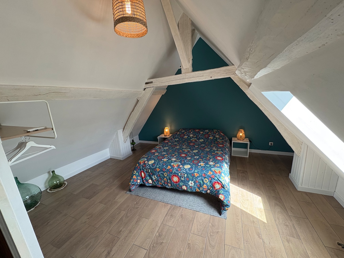 Soyez les bienvenus dans une partie indépendante de ma maison, située à 15 min centre ville du Mans, à 10 min du circuit des 24h et à 5 min du Pole Européen du Cheval. Le logement se compose de 2 chambres mansardées à l'étage. Au rez de chaussée : salle de bain (baignoire), WC indépendant, ainsi qu'une pièce de vie avec un nouveau coin cuisine ! Vous pourrez également profiter de l'extérieur grâce au salon de jardin. Seule l'entrée est commune avec ma maison (accès condamné lorsque c'est loué).