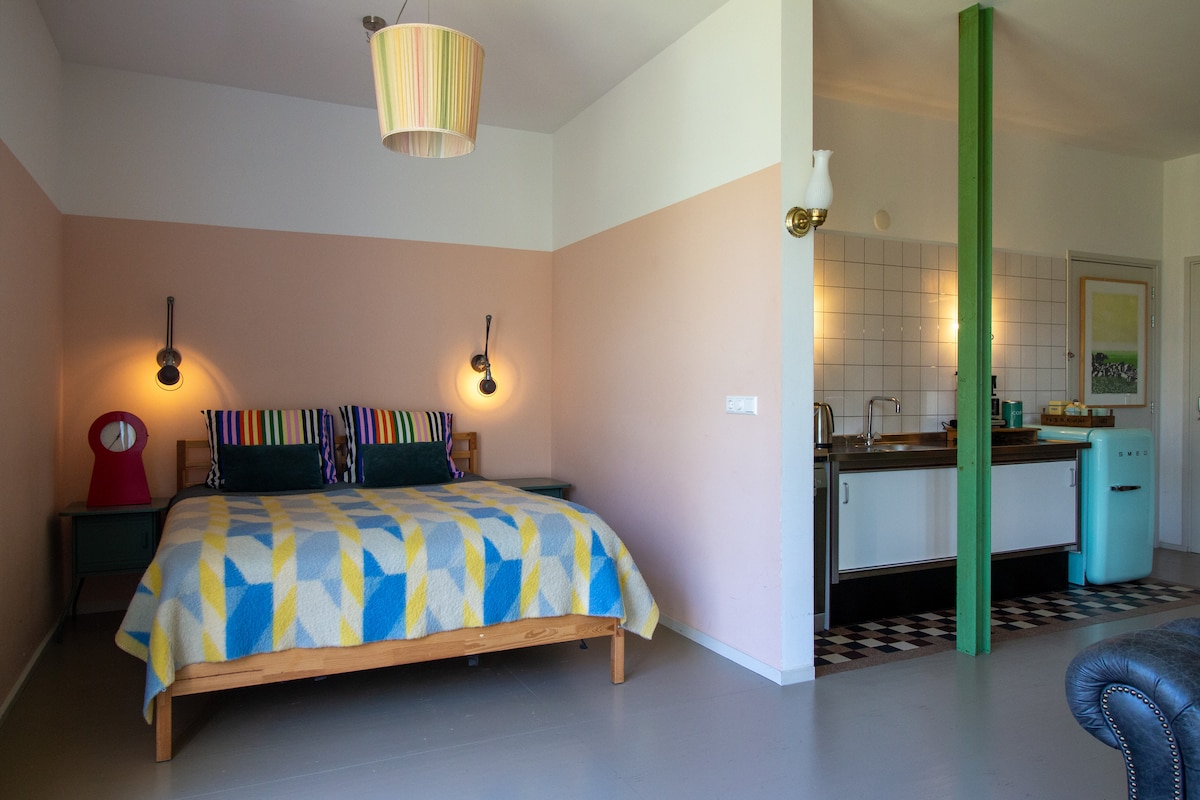 Private ground floor mid-century/modern designed cosy studio apartment with luxury details, as part of our larger home. Museum Square around the corner with all museums, the famous Albert Cuyp fresh market and diverse restaurants and breakfast/lunch/dinner cafes within minutes walk. The best our city center has to offer! ・ Best suited for 2 guests ・ You can book 3 months in advanced ・ Incl. fridge, kitchenware etc, but no full kitchen (no e.g. microwave) ・ Find our city tips in the Guidebook