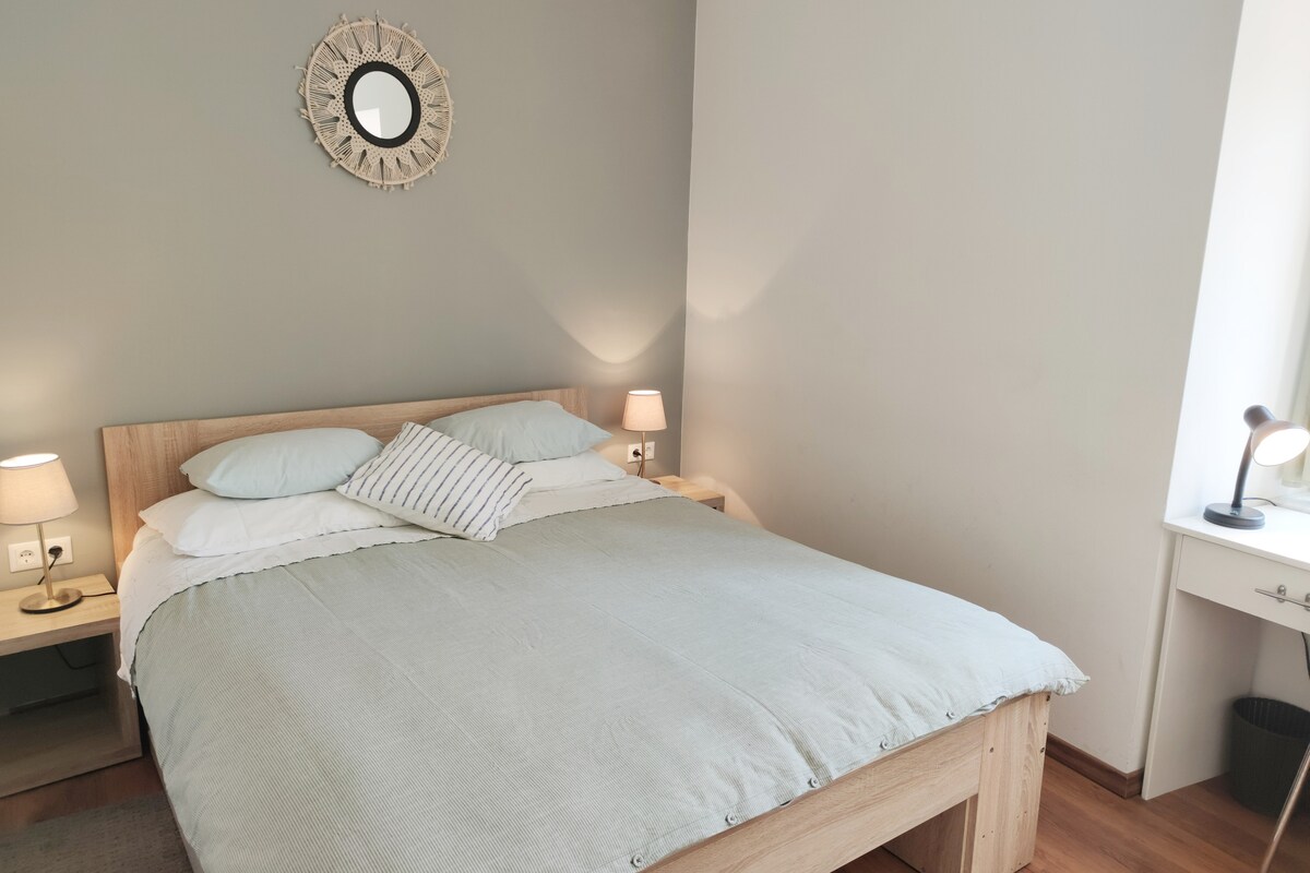 Chambre duplex moderne récemment rénovée au centre-ville dans une rue calme. Au premier étage, il y a une salle de séjour moderne avec un canapé et un bureau avec un minibar et un coffre-fort, tandis qu'au premier étage, il y a une chambre confortable avec une salle de bains moderne et un lit spacieux. La place principale est à 100 mètres et le musée de l'Illusion et le musée du verre sont à 50 mètres. La maison est entourée d'une variété de restaurants et de monuments. Il y a des lieux de fête et des commerces de proximité. Il se trouve à environ 10 minutes à pied de la plage. L'orgue de mer et le soleil sont à environ 10 minutes à pied.
