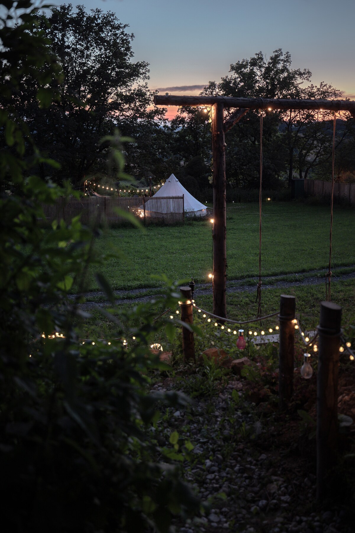 Tente glamping élégante dans un jardin isolé au bord d'un étang, parfaite pour la détente estivale pour deux et les enfants. Intimité, paix de la nature et confort à portée de main. L'évasion parfaite de l'agitation quotidienne. Profitez du cadre magnifique de ce logement romantique en pleine nature.