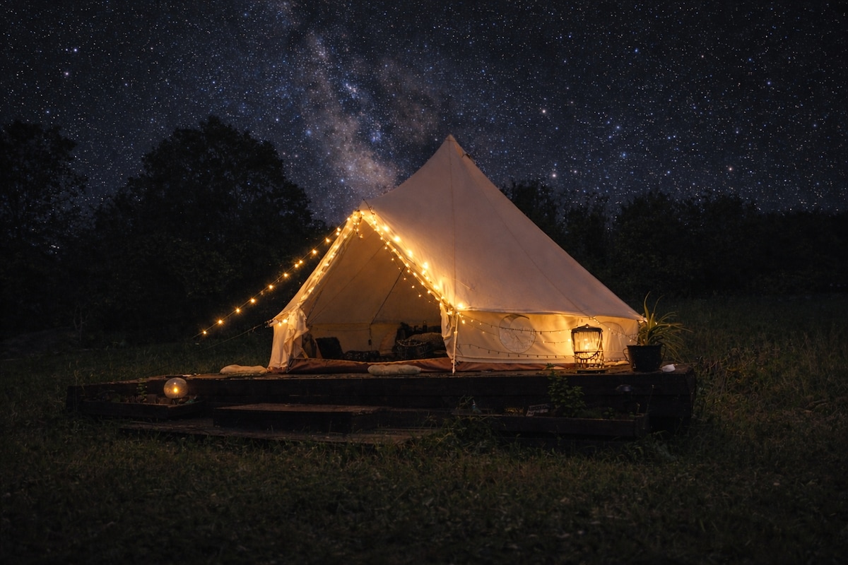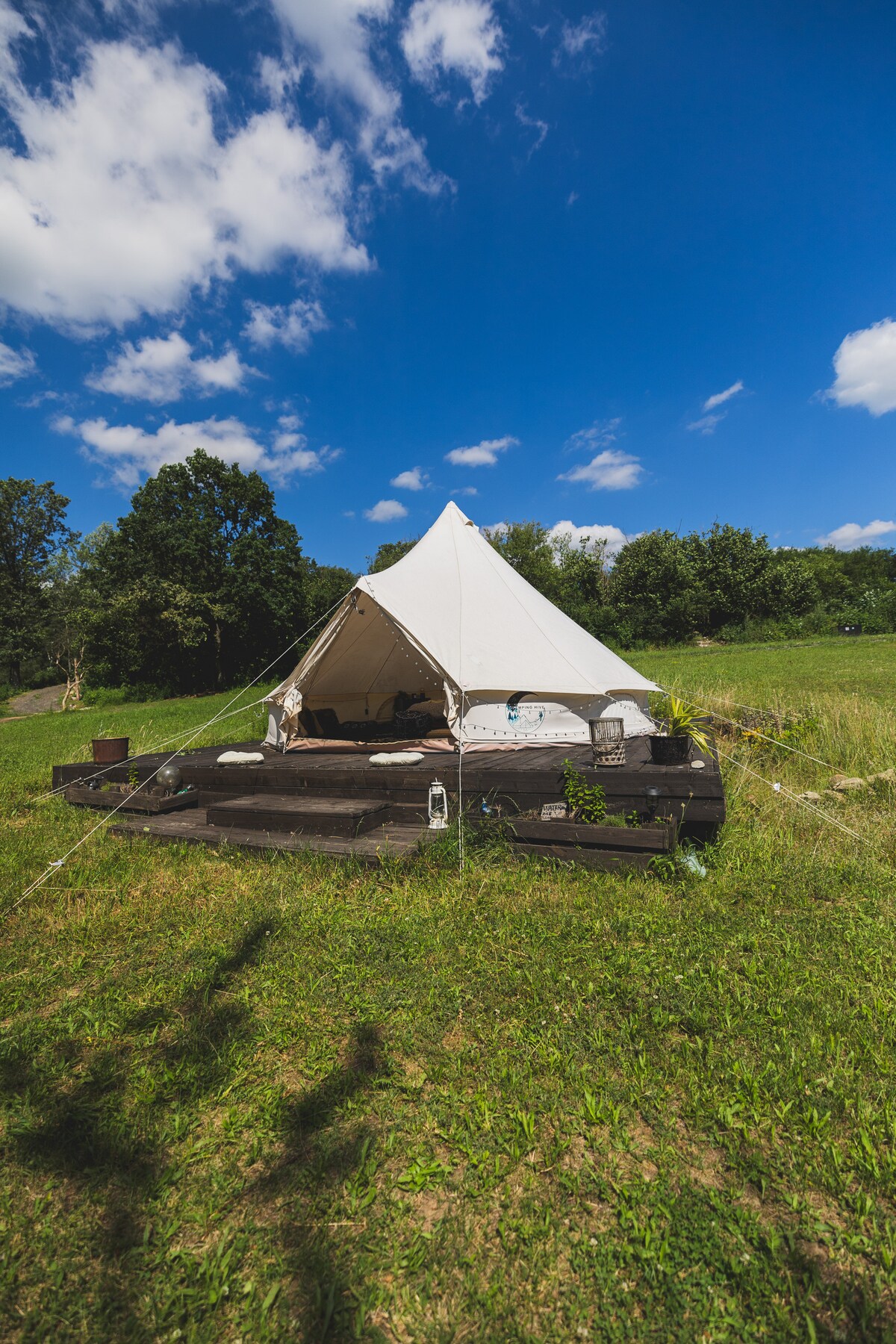 Profitez d'un calme parfait dans une tente de luxe en nature avec tout compris. Découvrez un camping incroyable au milieu de la nature, laissez vos rêves se réaliser sous un ciel plein d'étoiles. Une tente en coton meublée de luxe avec tout le confort vous attend. Ici, vous pouvez vous déconnecter de l'agitation de la ville, lire ou cueillir des champignons ou des baies. La tente n'est qu'à une heure et demi de Prague. Le stationnement est gratuit directement dans l'établissement. PARKING GRATUIT, TOILETTES 🅿️ PRIVÉES 🚻