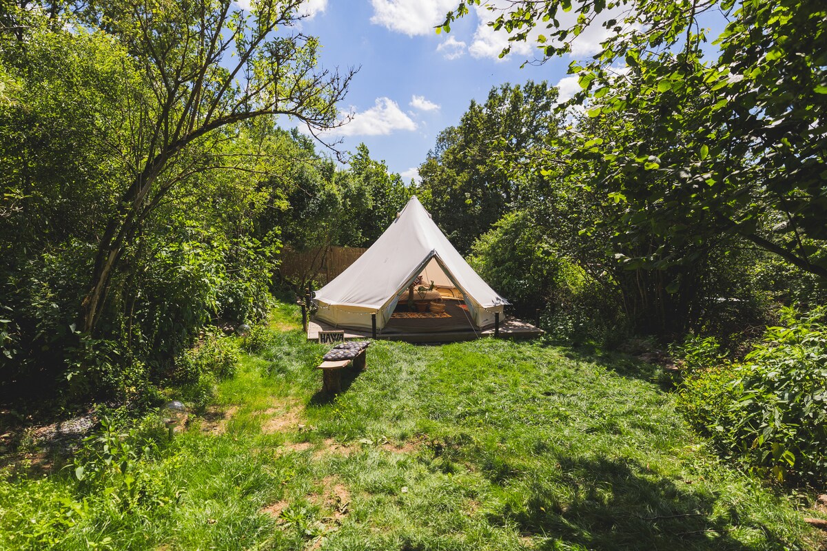 La tente est chauffée par un poêle électrique Déconnectez-vous dans ce glamping paisible entouré d'arbres fruitiers, de chants d'oiseaux et d'air frais de la forêt. Nichée entre un ruisseau paisible et un grand étang naturel, cette tente offre une escapade tranquille dans la nature bohème.