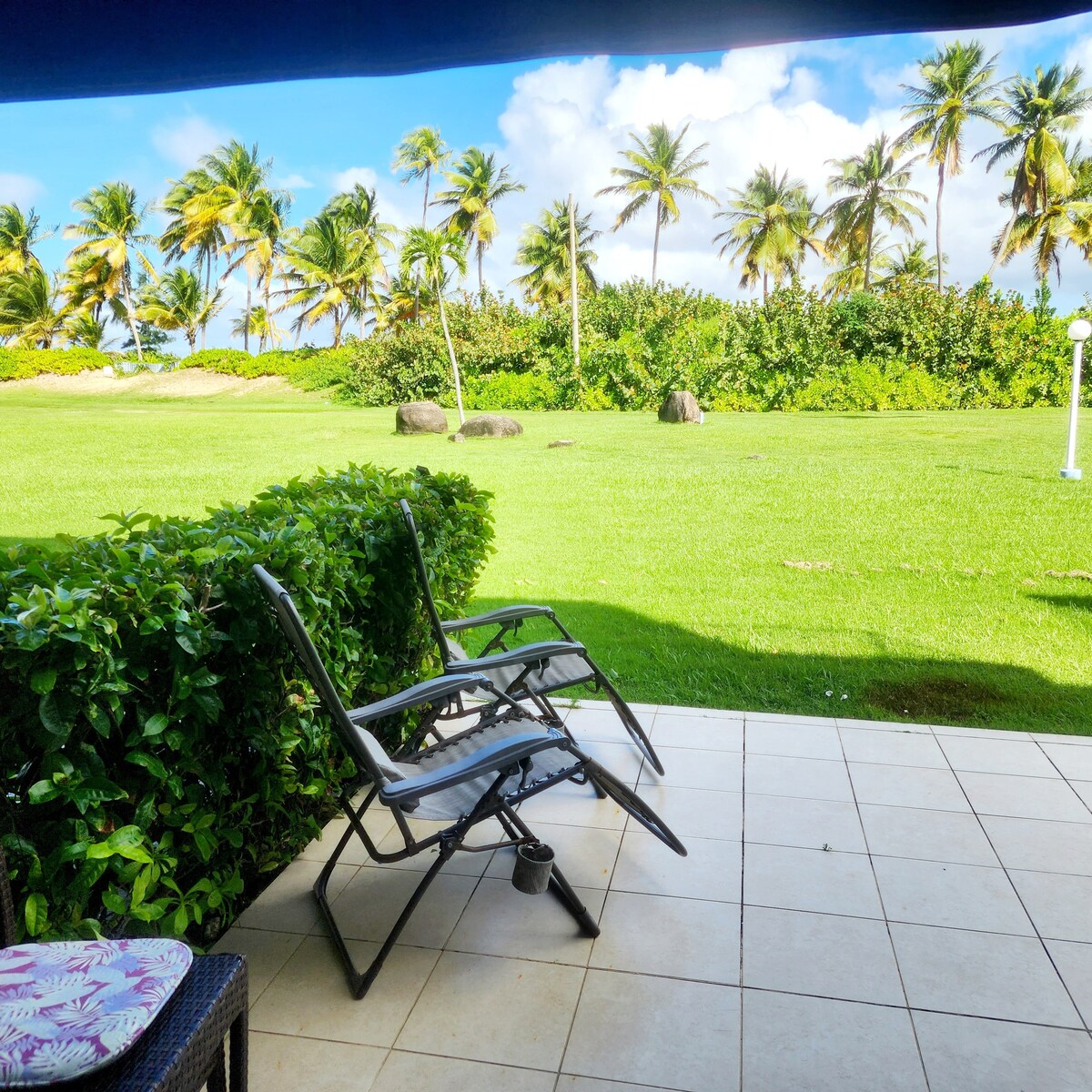 Appartement de 750 pieds carrés. Appartement d'angle moderne et aéré au rez-de-chaussée (sans escalier) avec plage privée et terrasse dans un complexe fermé, parking privé et WiFi. Appartement très équipé. À seulement 30 minutes de l'aéroport. À 2 minutes à pied du sable. Parfait pour les couples ou les familles. Il y a 2 piscines, un court de tennis, un terrain de basket et de beach-volley, un parc pour enfants, une salle de sport extérieure et une belle plage. À seulement 2 miles en voiture de la forêt tropicale d'El Yunque, équitation, VTT, terrains de golf, boulangerie, restaurants, etc.