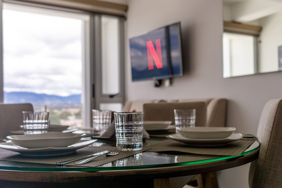 Élégant appartement avec une vue spectaculaire sur les montagnes, la ville et l'aéroport. Il est situé dans un quartier exclusif et central. Le bâtiment est aménagé pour accueillir des voyageurs Airbnb et dispose d'équipements pour leur confort. À quelques minutes, vous trouverez tout ce dont vous avez besoin : supermarchés, aéroport, restaurants et loisirs. Nous avons conçu cet espace pour que vous vous sentiez comme à la maison dans un cadre élégant, confortable, très calme et accueillant.