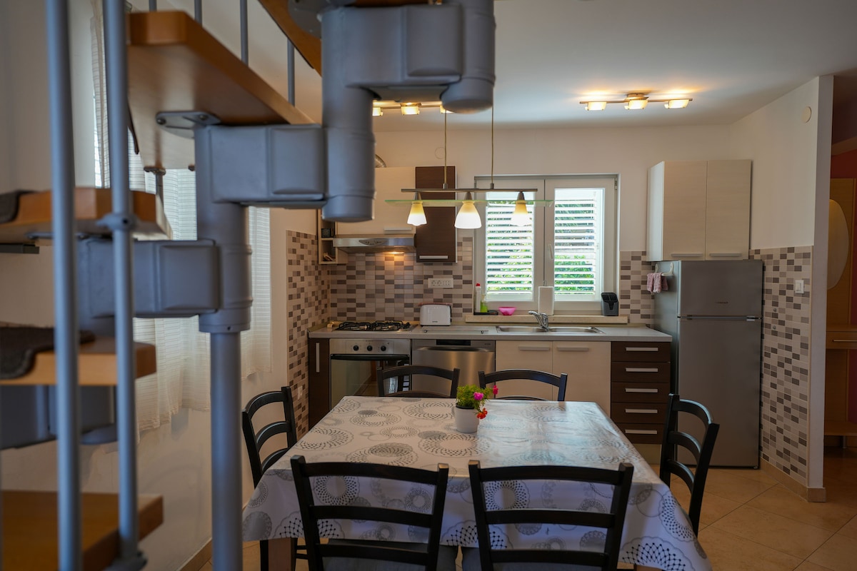 Lumineux et accueillant, KALINA est situé dans un quartier résidentiel calme. À seulement quelques minutes à pied de la ville, notre emplacement offre une vue incroyable sur l'Adriatique, les montagnes et la ville. La plage de sable se trouve à quelques minutes de marche de l'appartement, faisant de Kalina un excellent endroit pour des vacances en famille.